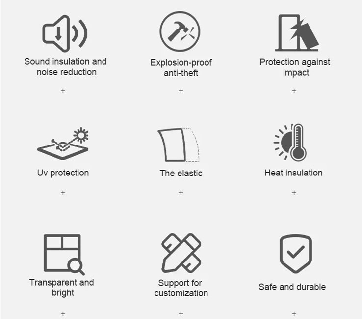 Performance advantages | Safety, Security,Hurricane resistance, Earthquake resistance,Bulletproof,Explosion-proof, Noise reduction, Sunlight control, UV protection, Water pressure resistance. |